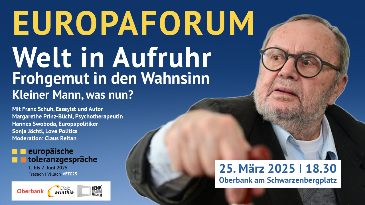Die Europäischen Toleranzgespräche vom 1. bis 7. Juni 2025 in Kärnten behandeln den WahnSinn unserer Gegenwart und versuchen, Strategien und Lösungen für den Umgang mit dem Unberechenbaren zu entwerfen. Einen Vorgeschmack gibt das Europaforum am 25. März in der Wiener Oberbank am Schwarzenbergplatz, dass der Denk.Raum.Fresach gemeinsam mit dem Club Carinthia organisiert. Mit dabei der Autor und Essayist Franz Schuh, der mit Claus Reitan über die „Welt im Aufruhr – Frohgemut in the Wahnsinn“ sprechen wird und mögliche Antworten liefert.